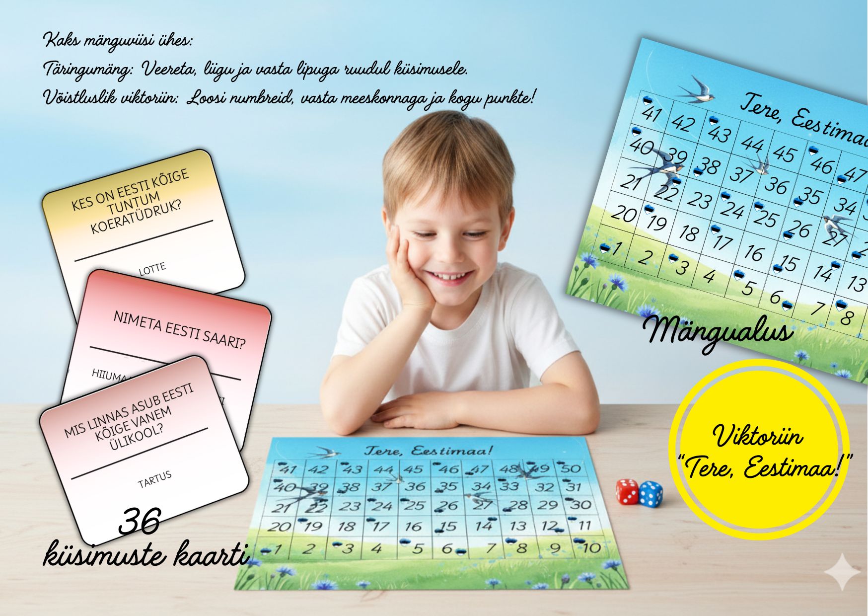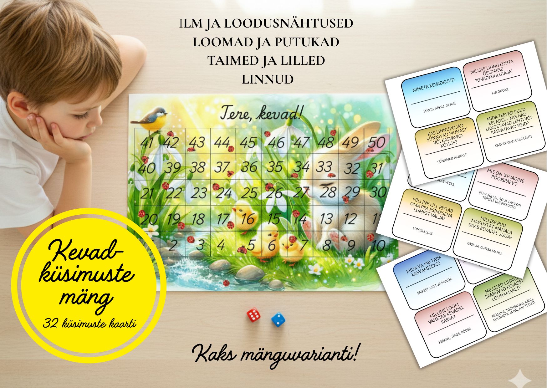 Komplektis: Mängualus (soovituslik A3 print), küsimuste kaardid ja selge mänguõpetus.
