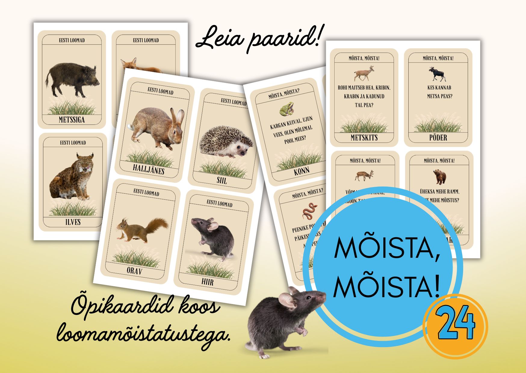 24 nutikat õpikaarti: Iga looma kohta on pildikaart ja vastav mõistatuskaart.