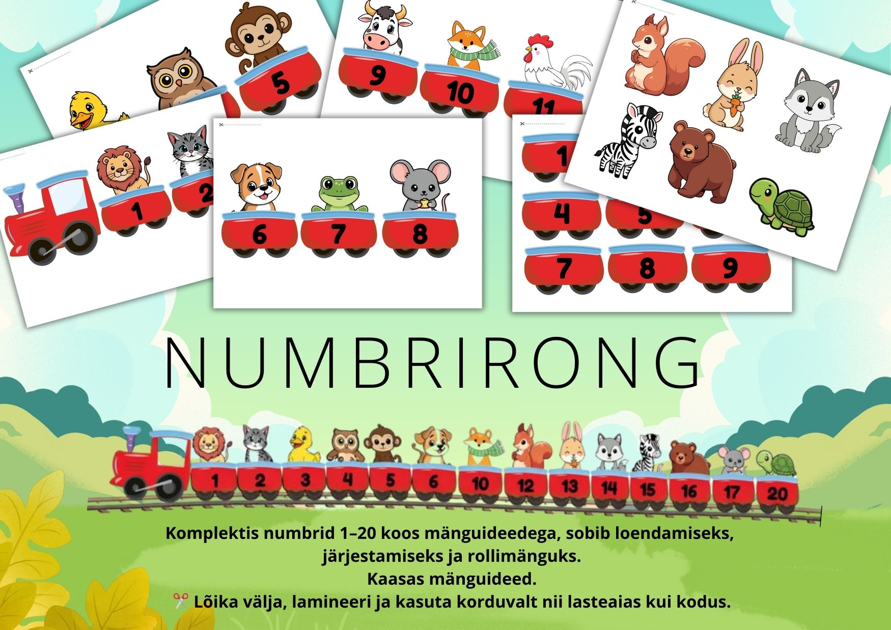 Numbrirong on mitmekülgne prinditav õppematerjal, mis ühendab numbrite õppimise, keele arendamise, liikumise ja loovuse. Igas vagunis on number ja loom, lisaks tühjad vagunid, mis annavad lastele võimaluse ise mõelda, jutustada ja mängu juhtida. Sobib kasutamiseks nii laual, seinal kui ka põrandal.